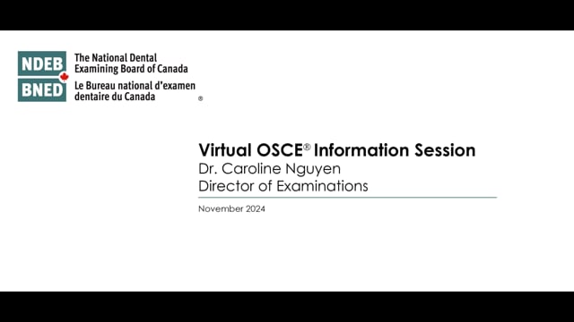 The Virtual OSCE is a summative examination that assesses the problem solving and critical decision-making skills required of beginning dental practitioners in Canada. Examination items are based on the knowledge, skills and abilities of beginning dental practitioners in Canada. The Virtual OSCE is a national standard of competence for dentists in Canada. The examination leads to NDEB certification and is required for licensure in Canada.